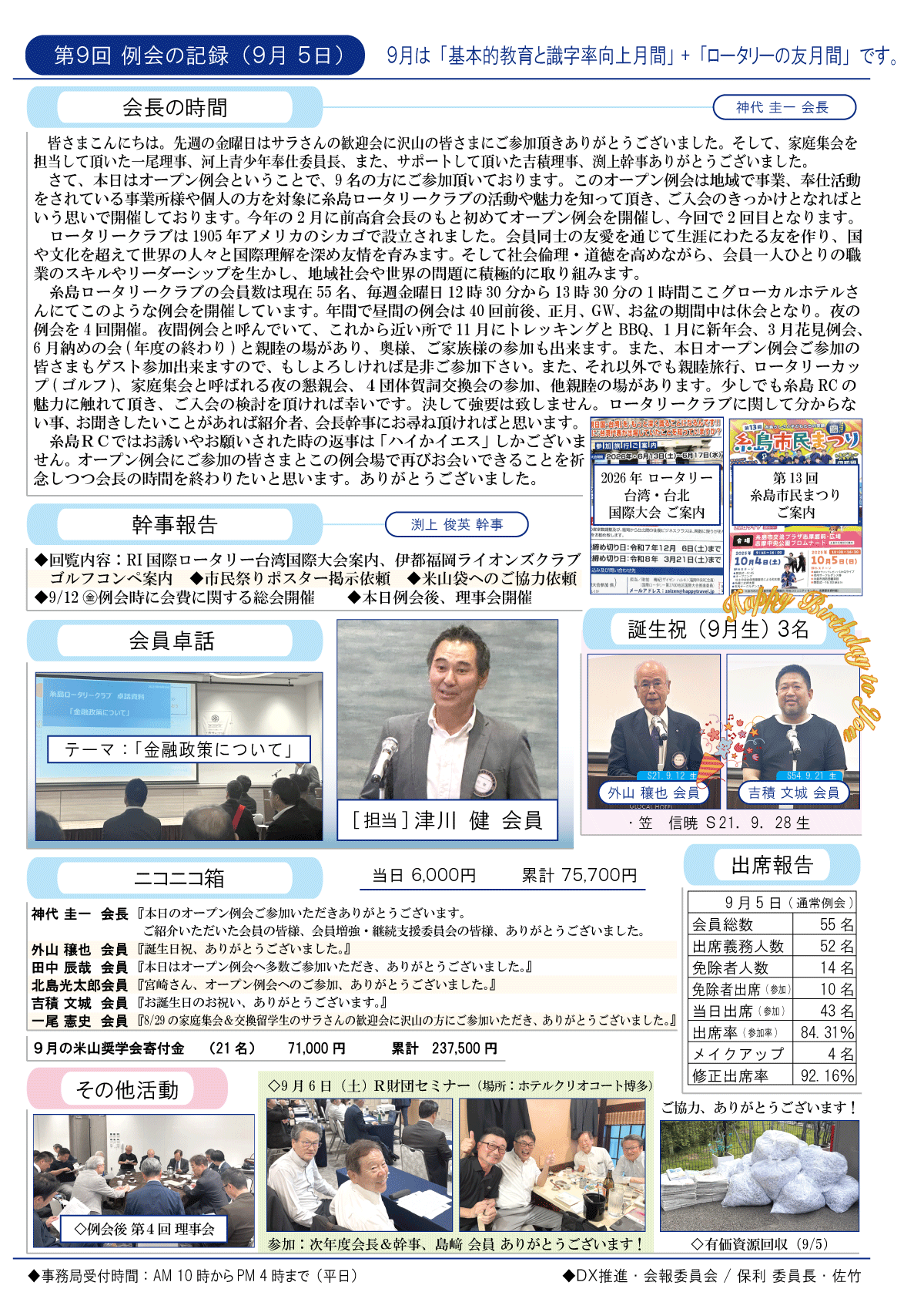9日(金)週報(通常対面形式例会)