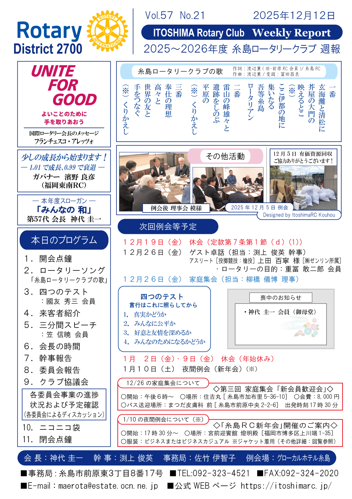 15日(金)週報(12/25リモート例会報告)、休会、リモート会議あり
